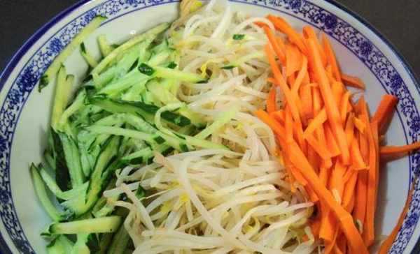 面条,绿豆芽,黄瓜,胡萝卜,芝麻酱,蒜,葱,去皮花生,盐,鸡精,白糖,醋