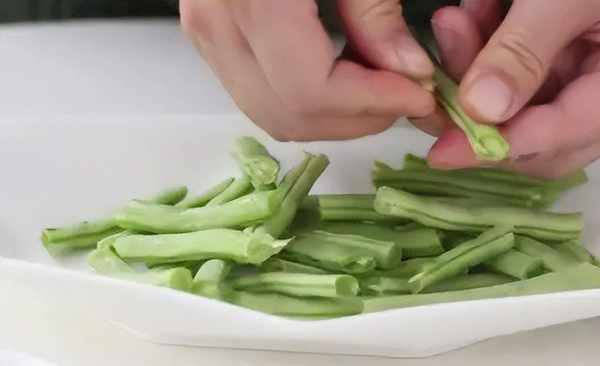 1、豆角清洗干净,去掉筋和两头,掰成小段;大蒜剥开,切成蒜末。