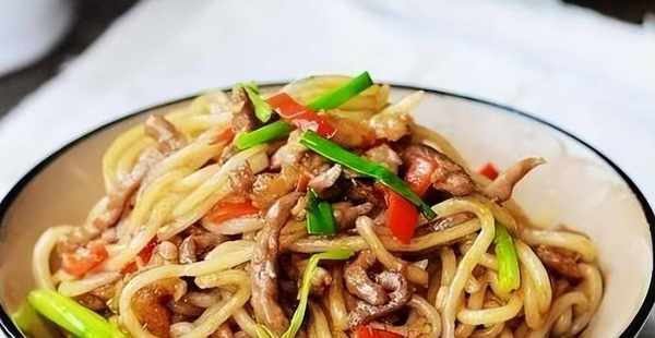 5、炒至肉丝变色,放入胡萝卜丝和洋葱丝,翻炒30秒;放入面条和青椒丝,开大火,翻炒均匀。