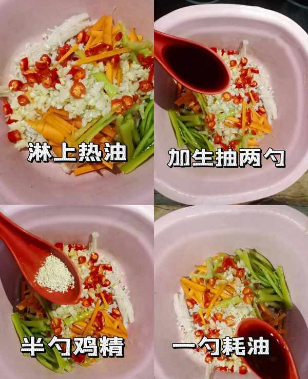 4.在盆中淋上热油、加2勺生抽、半勺鸡精、1勺耗油、少许的盐、2勺陈醋、半勺白糖,最后加入辣椒油后拌匀就可以看开吃啦~