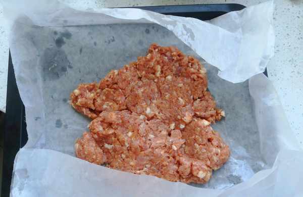根据烤盘的大小铺一层烤纸,装入300克肉馅,垫一张保鲜膜在烤盘上擀平整。注意尽量把边缘擀平整,厚度均匀一些。