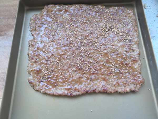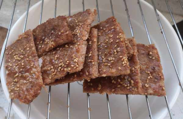 猪肉表面刷一层蜂蜜水,撒上白芝麻。烤箱180℃提前预热10分钟,180℃烤10分钟,肉的表面变干变硬后翻面刷蜂蜜撒白芝麻再烤5分钟,继续翻面继续刷蜂蜜。烤的过程中注意观察猪肉脯的颜色,红润油亮即可。