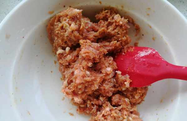 超市买一斤猪腿瘦肉,加工成瘦肉馅。肉馅加20克糖,5克生抽,3克胡椒粉,5克盐、3克辣椒粉、5克白酒腌制,再放10克淀粉拌匀。