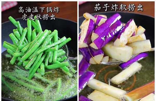 第二步:锅中倒油,油温高再放入豆角下锅炸,炸至虎皮状捞出,再放茄子炸软捞出