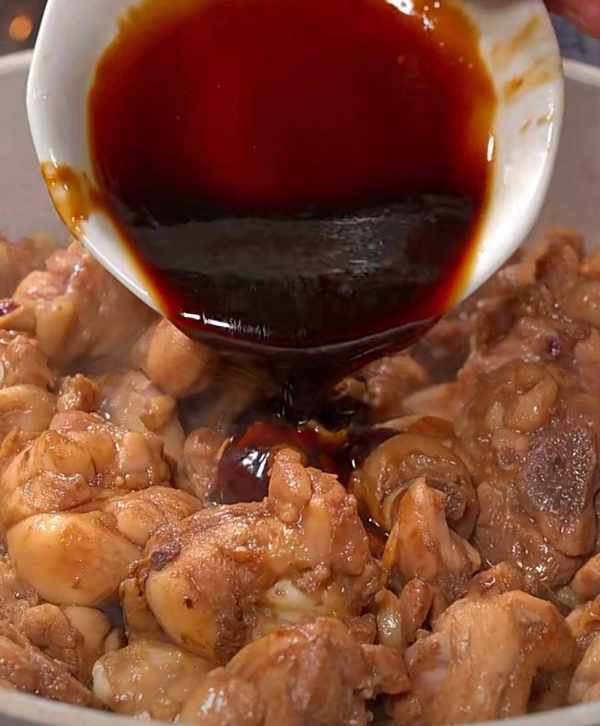 第四步:把鸡肉倒在锅中翻炒,炒至变色,再倒入剩余的腌制调料(可以加一点水)