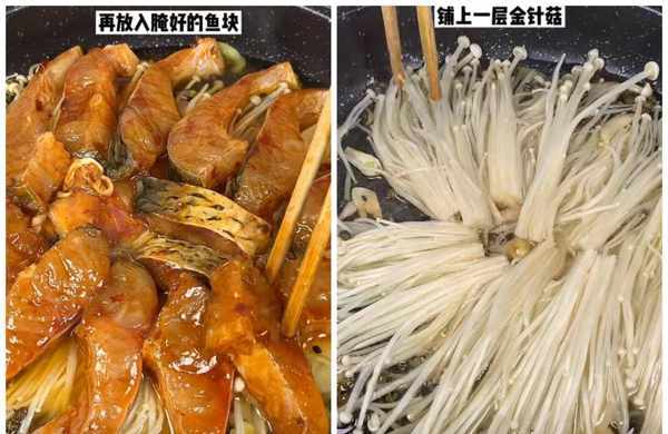 第三步: 锅中倒油,油热放葱姜蒜花椒爆香,再铺上一层金针菇,再放入腌好的鱼块,来一罐啤酒