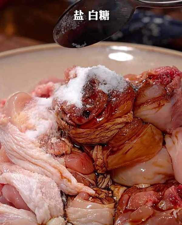 第二步: 切好的鸡腿放在盘中,放一勺生抽,半勺老抽,适量的盐,半勺白糖,半勺胡椒粉,一勺蚝油,抓拌均匀腌制10分钟