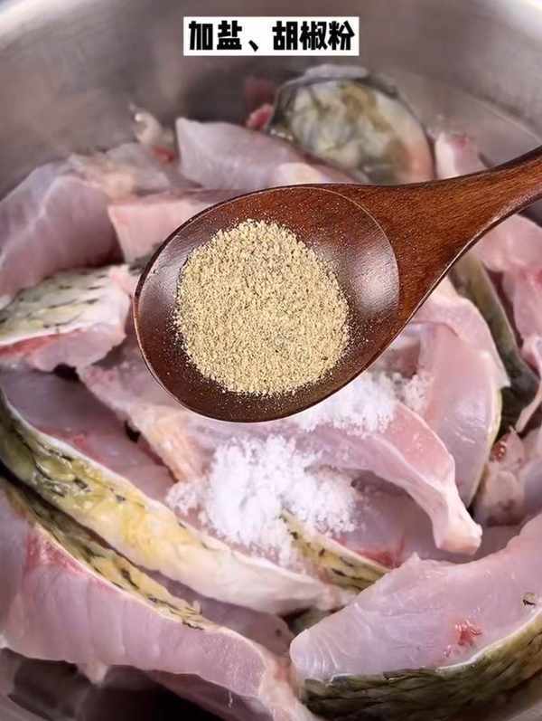 第一步:草鱼清洗干净切成块,放到盘中加半勺盐,少量胡椒粉,一勺料酒,一勺生抽,一勺老干妈,几片姜片抓均匀腌制20分钟