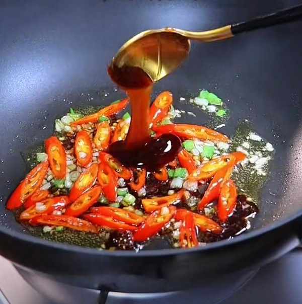 第三步:锅中放少量的油,放入姜葱蒜,小米辣炒香,一勺生抽,一勺蚝油,半勺老抽,半勺胡椒粉,小火炒香再放半碗清水