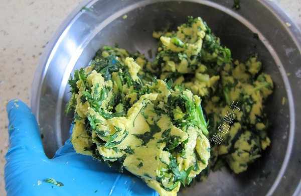 4,把揉蔫的茼蒿菜,加到面里边去,用手揣几下,菜和面混合均匀了。