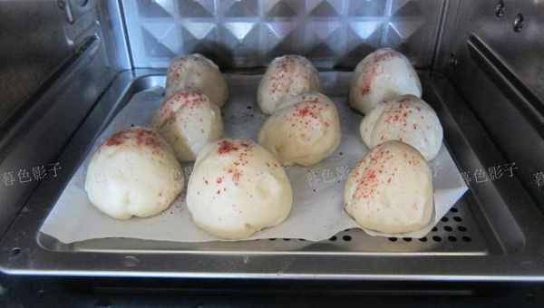 做好之后,放在铺油纸的笼屉上边,每一个之间留有空隙。二次发酵大约要30分钟左右,再刷红曲粉。纯蒸100度15分钟即可。