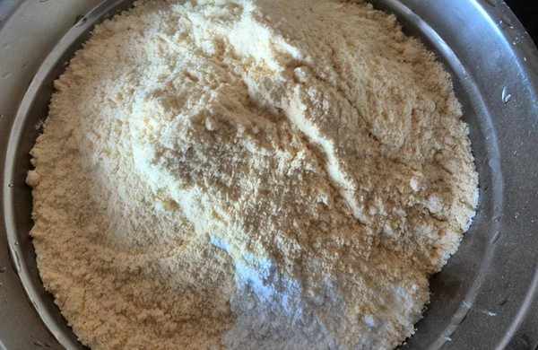 制作步骤;将主要的食材,玉米面和面粉混合一下,准备和面了。