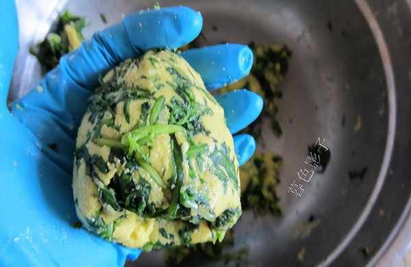 制作;玉米面用开水烫一下,不烫手的时候揉和成面团。