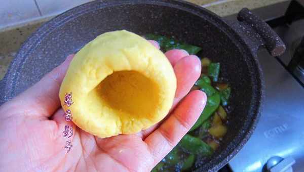 在菜里加适量的清水,取一块面做成窝头,摆放在菜上边。