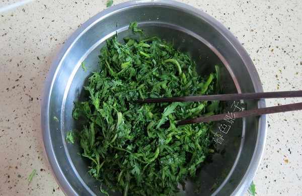 3,把洗干净切成段的茼蒿,加一勺盐揉一下,不然做窝头的时候,不好捏成型。