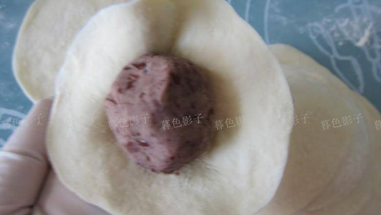 取一个豆沙馅,事先要团成团,这样比较好包。