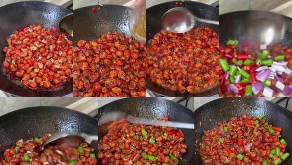 先把干辣椒和麻椒用开水泡一下减少一些辣味,增加一些香味。然后再准备点青红椒切成段,再切一点洋葱,把这基本的配料都准备好备用。配料咱就完事儿了啊。起锅,锅里加适量的清水,把龙虾尾倒进锅里,然后再加点去腥的料酒,水开后一分钟捞出控水备用。另起锅烧油,油热以后把龙虾尾下入锅中,用勺子来回翻炒,多炒一会儿啊,这样炒出的龙虾尾它容易脱壳,而且还没有那么特别大的异味和土腥味,把这个水分完全炒干,里面那个虾肉缩紧了就可以盛出来了。