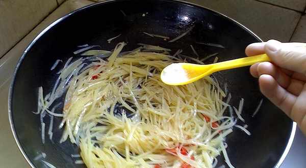 2、起锅加适量食用油,把葱姜蒜末和干辣椒粒下锅,爆炒出香味后,把浸泡过的土豆丝倒进锅里,翻炒两分钟后,加香醋、酱油、白糖和食盐,大火翻炒一分钟后,把切好的青红辣椒丝倒进锅里翻炒一分钟,最后撒撒点鸡精就可以出锅了。