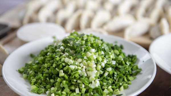 但这里要注意,放入韭菜之后,什么时候开始包饺子,什么时候放盐,盐放入得过早韭菜容易出水。