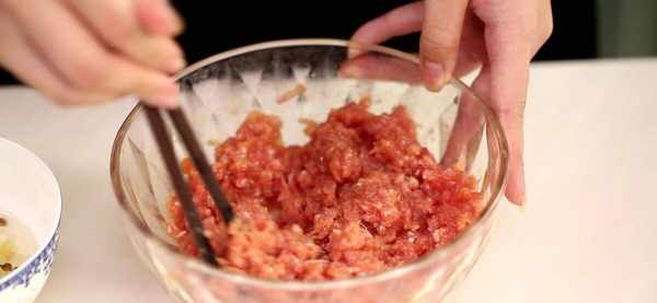 放打水的时候要少量多次不断地搅拌,让肉馅吸收水分,同时让肉馅有黏性,后期包起来才不会松散。