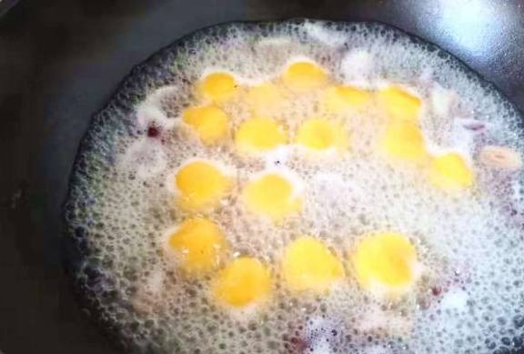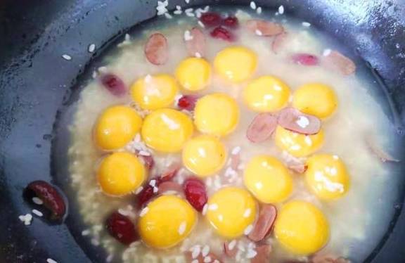 5、团子放入锅内,待水再次烧开后,再继续煮四五分钟,看到团子都浮起来,放入酒酿,再次煮开,就可以关火出锅了。
