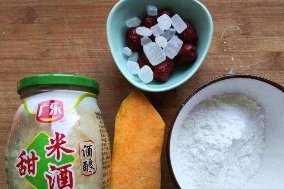 所需食材:酒酿200克,南瓜100克,糯米粉100克,红枣8颗,冰糖适量