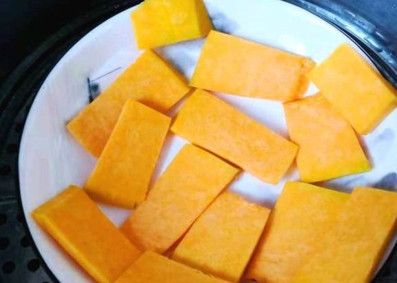 2、将准备好的南瓜切成薄片,放在蒸锅中,冷水上锅开始蒸,上气后再蒸6-7分钟关火,稍微焖一会取出。