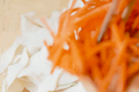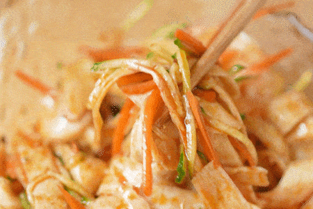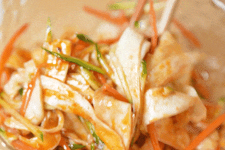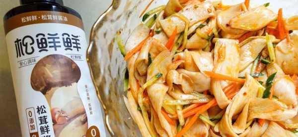3.碗中加入切好的胡萝卜丝和黄瓜丝,加适量零卡糖,1勺松茸一品鲜、1勺松茸调味料及适量松茸油醋汁和红油辣椒