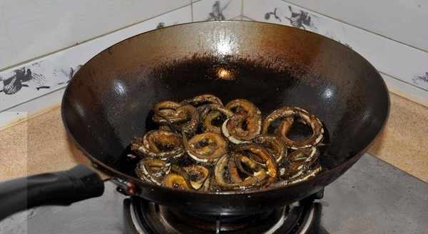 2、炒锅里烧油,油适量多一些,因为小黄鳝主要靠油煸出香味。油热后把葱姜蒜下锅煸炒出香味,把小黄鳝下锅翻炒片刻。加适量食盐、生抽翻炒,炒至小黄鳝入味,没什么汤汁后出锅即可。