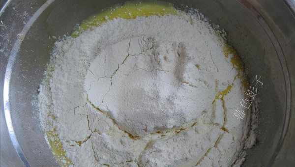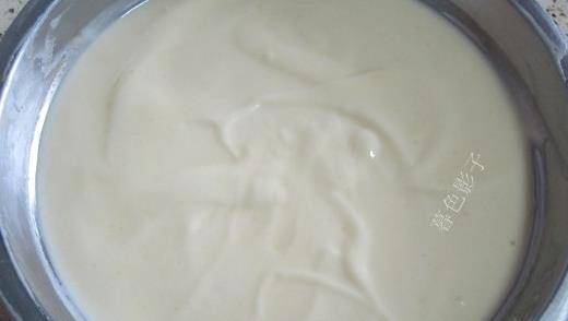 加过筛的面粉在蛋黄糊里,再手动搅打,成为蛋黄糊备用,拌好的蛋糕面糊盖上保鲜膜。