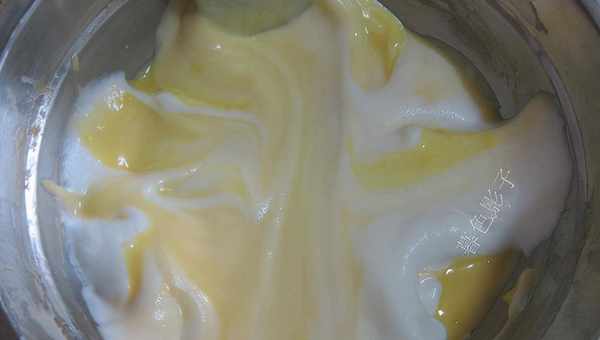 把适量的蛋清倒进蛋糕糊里,用画L手法搅拌蛋糕糊。每次加蛋清不要太多,这样拌的会均匀。最新的的不要转圈拌,那样会消泡,直接影响蛋糕口感。