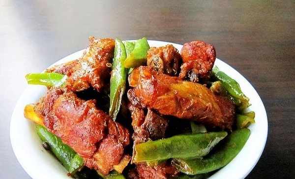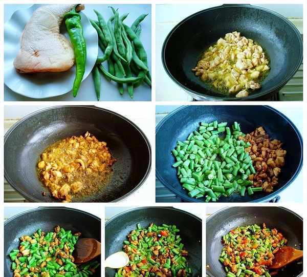 5、、把鸡腿拨一边,加四季豆翻炒出香味,中小火炒,一定要多炒一会,把四季豆炒出外皮微微发卷,这点很新的