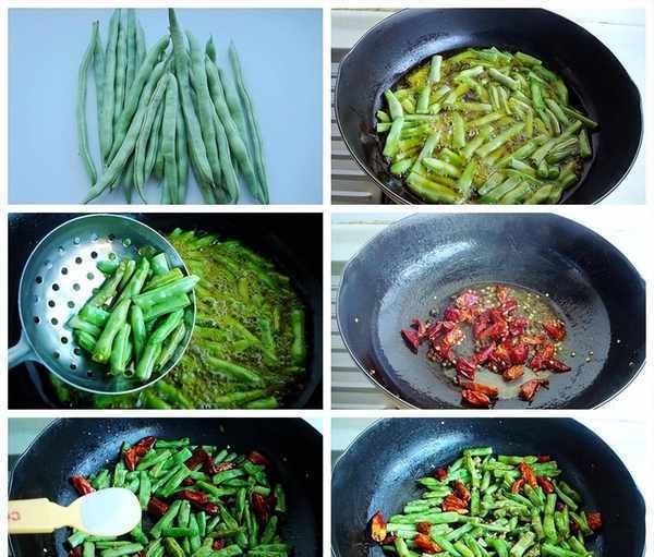 4、热锅凉油,油烧到6成热,加四季豆,不要把油烧得太热了