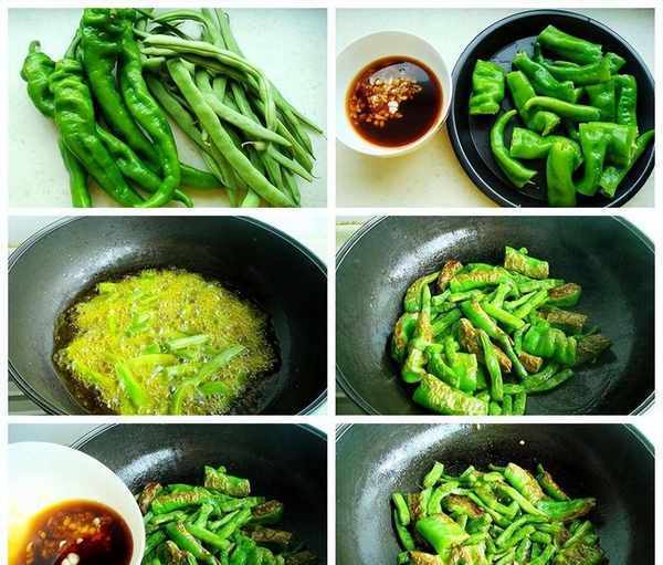 6、把多余的油到点出来,把青辣椒段下锅里煎