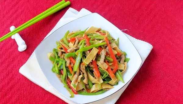 做法:1、把油皮用凉水浸泡软,洗净切丝