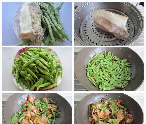 3 、热锅凉油,油热7成下花椒粒爆炒出香味,加辣皮子、姜末、四季豆翻炒均匀4、转小火煸出水分,加少许盐、干煸到四季豆外皮起泡泡成虎皮形状,加腊肉、青红辣椒,加头道酱油翻炒均匀稍微焖2分钟左右入味