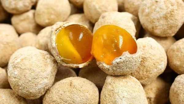 很多人会觉得拿生石灰裹得黑乎乎的东西怎么吃啊?其实制作好的变蛋里面很漂亮,呈金黄色,色泽光亮,又美又滑,看着十分诱人。