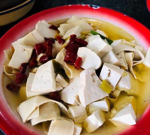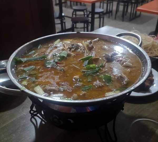 两位小伙子也不知道点啥,本来想点个旱鹅肉,也就是类似于白切鹅或者盐水鹅的吃法,屋内一口大锅煮好的鹅肉看着就很诱人,切成块淋上酱汁就可以吃了。但是大晚上小伙子们觉得有点凉意,于是决定点这个鹅块火锅,下面一个酒精炉子,上面是一大锅的鹅肉汤锅,还会送蔬菜,一大锅热腾腾的吃起来很惬意。