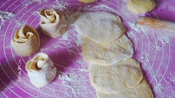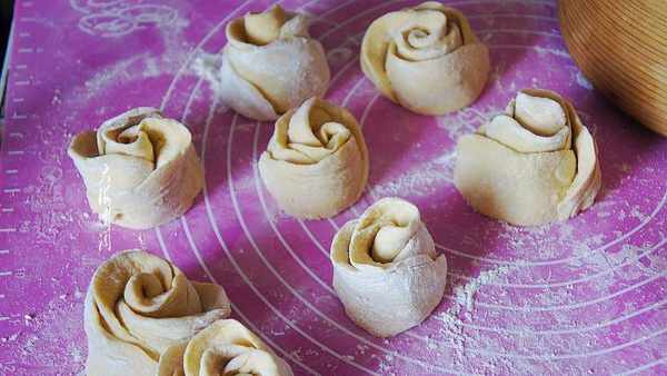然后从一边卷起来,从中间切开,就是两个玫瑰花卷了。依此类推,完成所有的花卷制作。