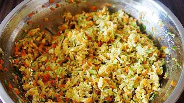 鸡蛋打散少许兑点料酒搅拌均匀去腥,起油锅,加入蛋液煎熟,边煎边搅拌,搅拌得越碎越好,取出晾凉备用。西葫芦擦成丝,加点盐腌制几分钟,出水后攥掉水分。韭菜切碎,胡萝卜擦丝后再切几刀,更碎一点。