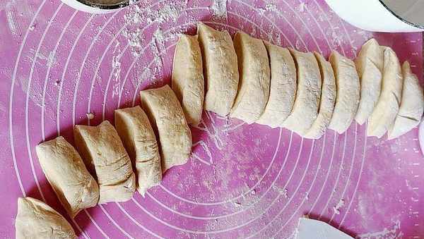 饧好的面团揉成长条,均匀分成16个小面剂子。