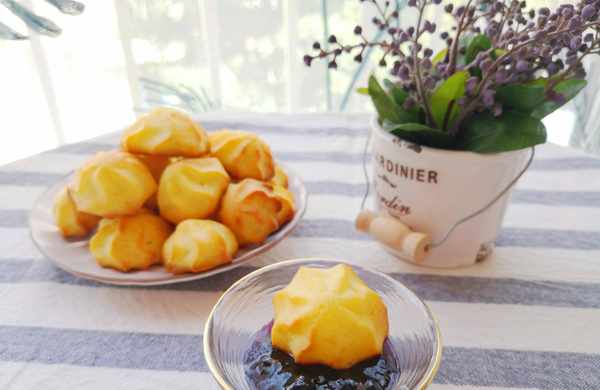 泡芙还可以了挤上内馅,比如卡士达酱,比如淡奶油酱都很好吃,但要注意,最好现做现吃,不然时间长了,里面的馅料会影响外面泡芙的口感,当然也可以不挤内馅,像我这样蘸着果酱吃,气质也不错哦,快来一起做起来吧。