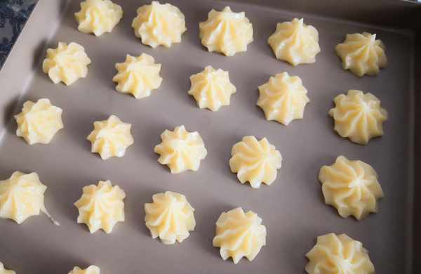 7. 面糊装到裱花袋里,裱花嘴选择类似星星嘴的就可以,把面糊挤到不粘烤盘上,