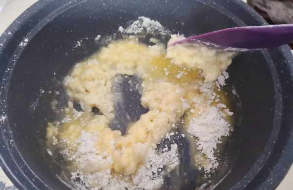 5. 鸡蛋打散,等面糊凉到手温的时候,分次加入蛋液,边加边搅拌,开小火加热,
