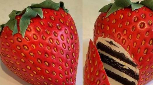 第2个,草莓蛋糕,这么大一个草莓,不知道的人还以为是画的一幅画呢,没想到切开之后里面竟然是蛋糕,这样的造型只有翻糖蛋糕才能做得逼真,不过看到这么好看的草莓蛋糕,真的是舍不得吃,里面还是用巧克力做完成的,非常不错的样子。