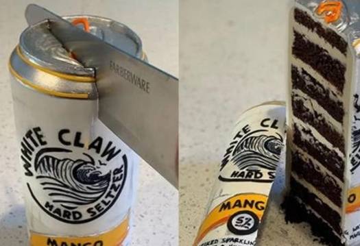 第1个,啤酒蛋糕,如果不说这是蛋糕的话,可能很多人都以为是一罐啤酒,用刀切开之后才发现原来是做的啤酒蛋糕,包装做得真的是非常的相似,啤酒罐子上面还有拉环,真的是非常佩服蛋糕师的手艺太逼真了。