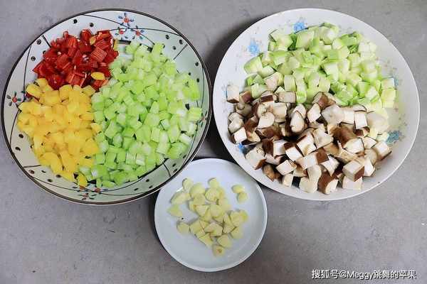 2. 芹菜、辣椒、甜椒、西葫芦、香菇分别切丁,大蒜切粒;