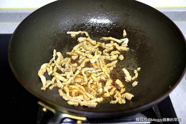 4. 温锅温油,肉丝入锅煸炒至表面变色,倒酱油调味、上色;