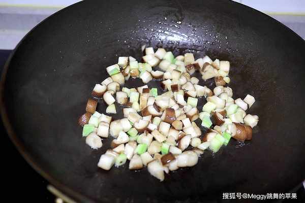 3. 温锅温油,大蒜炝锅,倒香菇丁,炒到周边有透明状;