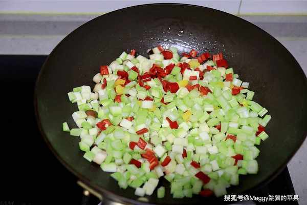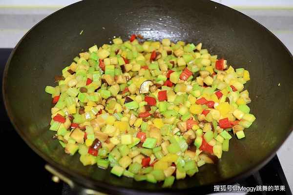 4. 其它蔬菜丁全部倒入锅中,翻炒2分钟;